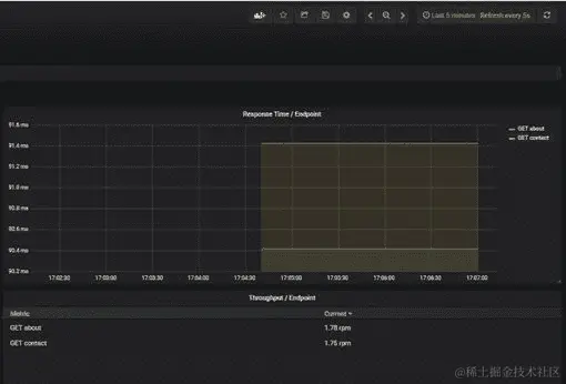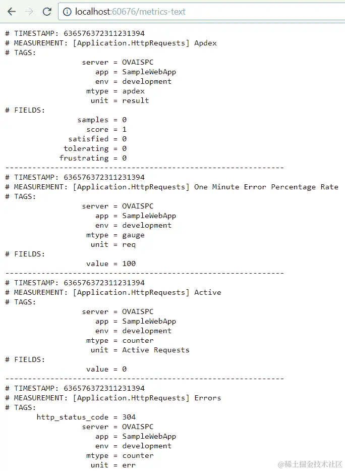 运行应用程序并进行一些导航。在应用程序 URL 中添加/metrics-text将以文本格式显示完整报告。以下是文本指标的示例快照: