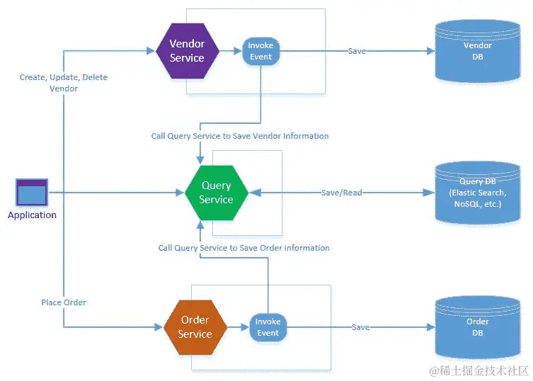CQRS 是一个原则,其中应用程序命令(如创建,更新和删除)被读操作分隔。它基于事件模型工作,当 API 上采取任何创建,更新或删除操作时,事件处理程序被调用并将该信息存储到其相应的数据存储中。我们可以在先前的供应商注册示例中实现 CQRS,这将方便从单个服务查询供应商及其订单。当在供应商或订单服务上执行任何命令(创建,更新,删除)操作时,它将调用处理程序来调用查询服务,将更新的数据保存到其存储中。