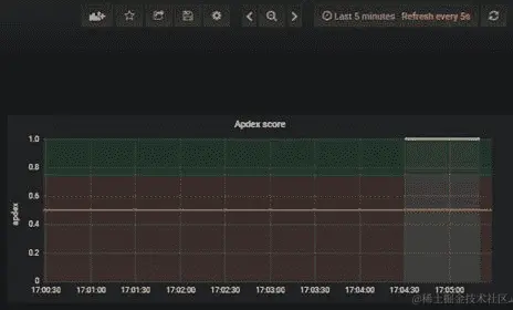 这里是 Apdex 分数,将用户满意度分为三种不同的颜色,红色代表令人沮丧,橙色代表容忍,绿色代表满意。以下图表显示蓝线绘制在绿色条上,这意味着应用程序性能是令人满意的: