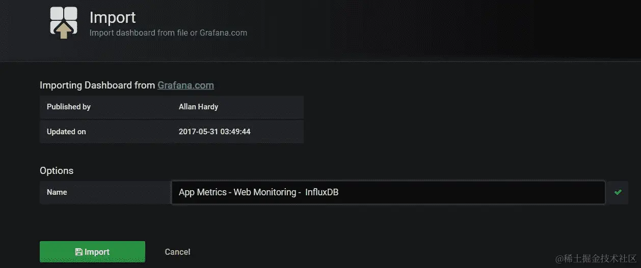 Grafana 提供了一个现成的 InfluxDB 仪表板,可以从以下链接导入:grafana.com/dashboards/2125。