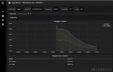 在上述代码中,我们将应用程序名称app设置为程序集名称,将环境env设置为stage。http://127.0.0.1:8086是 InfluxDB 服务器的 URL,用于监听应用程序推送的遥测。appmetricsdb是我们在前一节中创建的数据库。然后,我们添加了AddMetrics中间件,并指定了包含配置的指标。AddMetricsTrackingMiddleware用于跟踪显示在仪表板上的 Web 遥测信息,AddMetricsReportScheduled用于将遥测信息推送到数据库。