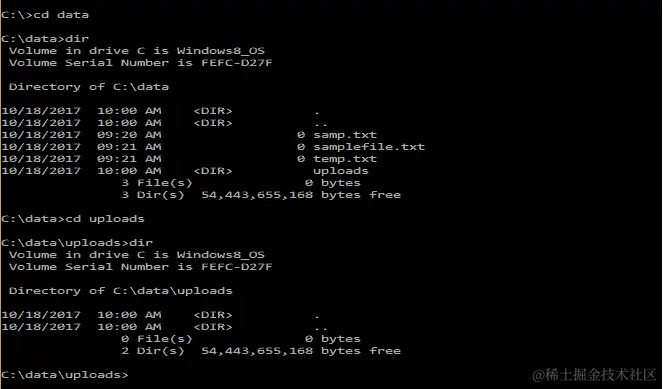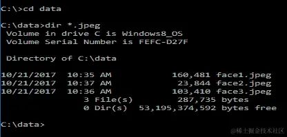 在下一个阶段的过程中,您必须确保您有要读取的图像。因此,请在C:\驱动器的某个位置放置一些图像。例如,图 26.5.6显示了针对此特定计算机上的C:\data目录运行dir *.jpeg命令时获得的列表: