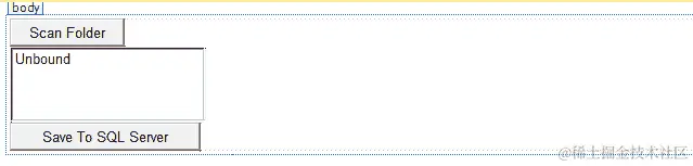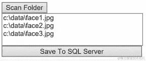 转到设计视图,如图 26.5.2所示,您将得到此项目的非常简单的界面:一个扫描文件夹按钮,用于获取文件名,然后一个保存文件到 SQL Server 的按钮: