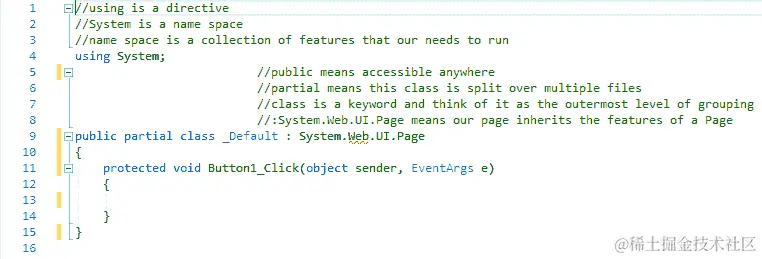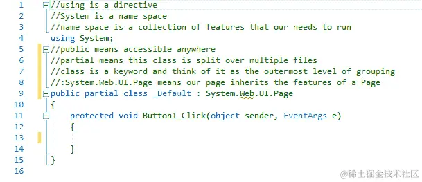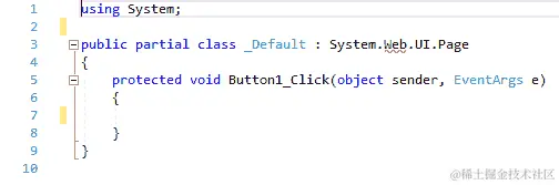 现在让我们逐行通过代码的创建。因此,从以protected void Button1_Click...开头的行开始,在一组花括号中输入以下内容:
