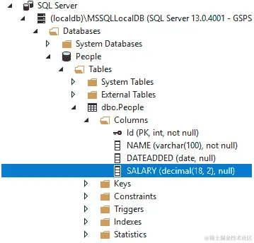 这是一个新的字段类型,decimal (18,2)表示一个宽度为 18 个单位且有 2 位小数的字段;也就是说,它总共有 18 个单位宽,右边有 2 个单位,左边有 16 个单位,总共有 18 个单位。接下来,点击“更新”,然后点击出现的对话框中的“更新数据库”按钮。现在,您可以在 SQL Server 对象资源管理器窗格中看到,该字段已添加,如图 19.4.1所示:
