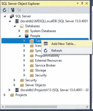 您需要有一个数据库表,可以在其中保存文件。首先打开 SQL Server 对象资源管理器。您会记得您有一个名为People的数据库。转到表文件夹,在其上右键单击,并选择添加新表...,如图 26.5.3所示:
