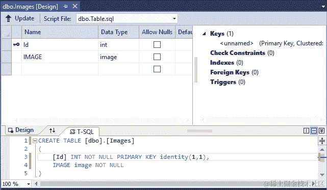 然后更新此内容,然后单击出现的对话框中的“更新数据库”按钮。等待更改生效。因此,如果展开表节点,您应该看到一个带有 IMAGE 列的 dbo.Images 表,如图 26.5.5所示: