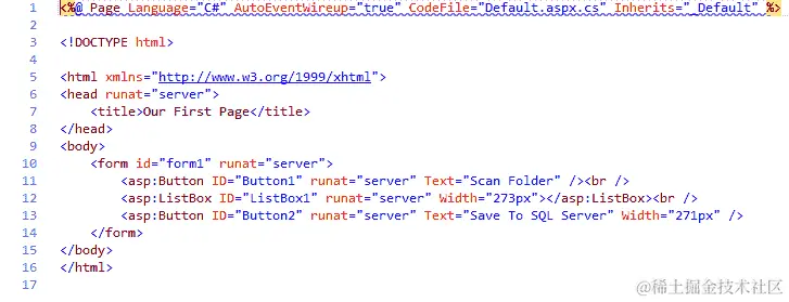 打开一个包含基本 HTML 的项目。这里需要做的第一件事是插入一个按钮。要做到这一点,转到工具箱,然后将Button控件拖放到以<form id=...开头的行下方。请记住,我们将在此项目中构建的简单界面将涉及单击按钮并从硬盘中读取文件到列表框中。更改Button控件上的文本为扫描文件夹。您将在此项目中扫描图像文件夹。