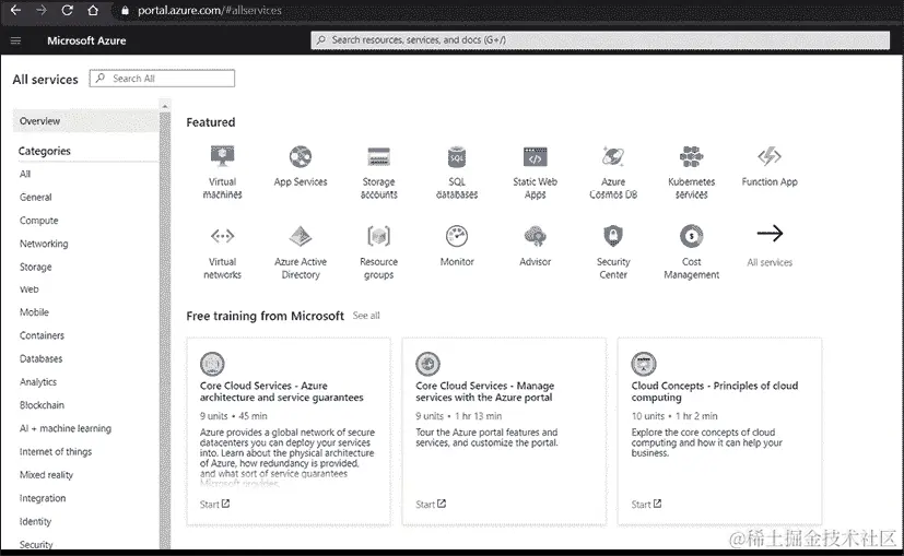 一旦您访问了这个门户,就可以注册。如果您以前从未这样做过,可以选择免费开始,这样您就可以在不花钱的情况下使用一些 Azure 功能。请查看
