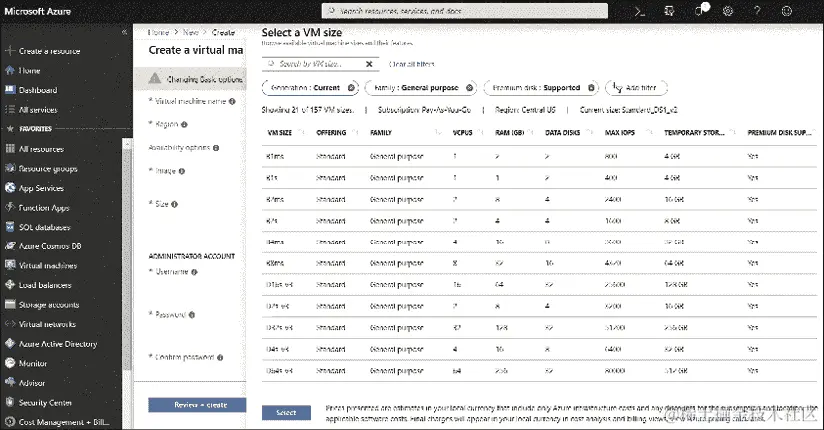 图 4.2:Azure 中可用的虚拟机大小