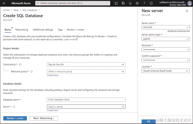 创建 SQL 数据库的步骤非常简单,就像我们之前为其他组件所见的那样。但是,有两件事情需要注意:服务器本身的创建以及如何收费。