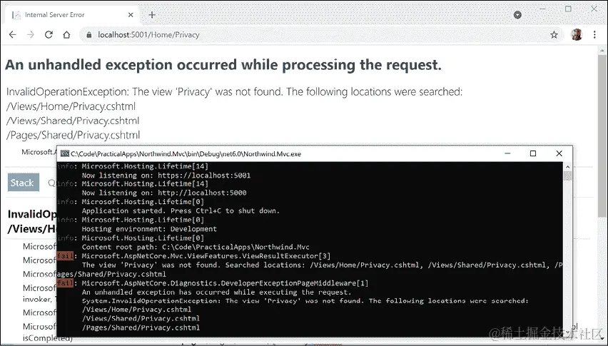 Northwind.Mvc项目中,展开Properties文件夹,打开launchSettings.json文件,并注意为项目配置的随机端口号(你的将不同),用于HTTPS和HTTP,如下所示:"profiles": { "Northwind.Mvc": { "commandName": "Project", "dotnetRunMessages": true, "launchBrowser": true, "applicationUrl": "https://localhost:7274;http://localhost:5274", "environmentVariables": { "ASPNETCORE_ENVIRONMENT": "Development" } }, -