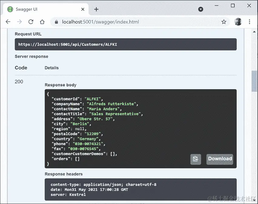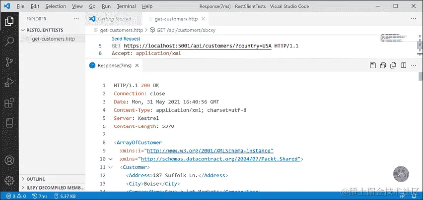 launchSettings.json以配置Minimal.WebApi配置文件,使其通过 URL 中的端口5003启动浏览器,如下面的标记中突出显示的那样:"profiles": { "Minimal.WebApi": { "commandName": "Project", "dotnetRunMessages": "true", "launchBrowser": true, **"applicationUrl"****:** **"https://localhost:5003/api/weather"****,** "environmentVariables": { "ASPNETCORE_ENVIRONMENT": "Development" }
