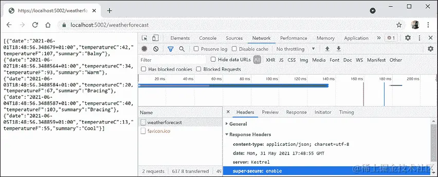 api/weather端点的信息消息,大约耗时 83ms,如下所示:info: System.Net.Http.HttpClient.Minimal.WebApi.LogicalHandler[100] Start processing HTTP request GET https://localhost:5003/api/weather info: System.Net.Http.HttpClient.Minimal.WebApi.ClientHandler[100] Sending HTTP request GET https://localhost:5003/api/weather info: System.Net.Http.HttpClient.Minimal.WebApi.ClientHandler[101] Received HTTP response headers after 76.8963ms - 200 info: System.Net.Http.HttpClient.Minimal.WebApi.LogicalHandler[101] End processing HTTP request after 82.9515ms – 200 -