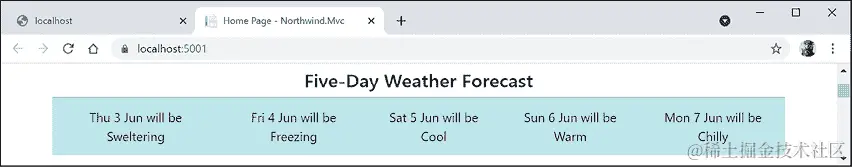 https://localhost:5001/,并注意天气预报,如图16.20所示:图 16.20:Northwind 网站主页上的五天天气预报