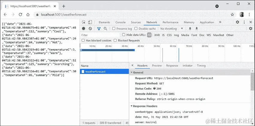 注意 Web API 服务应返回一个包含五个随机天气预报对象的 JSON 文档数组。