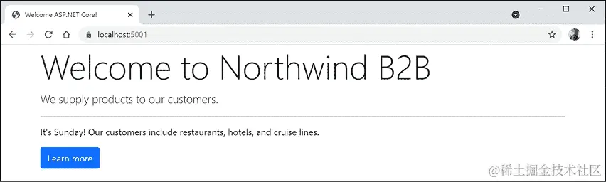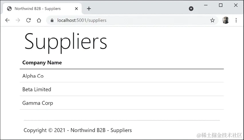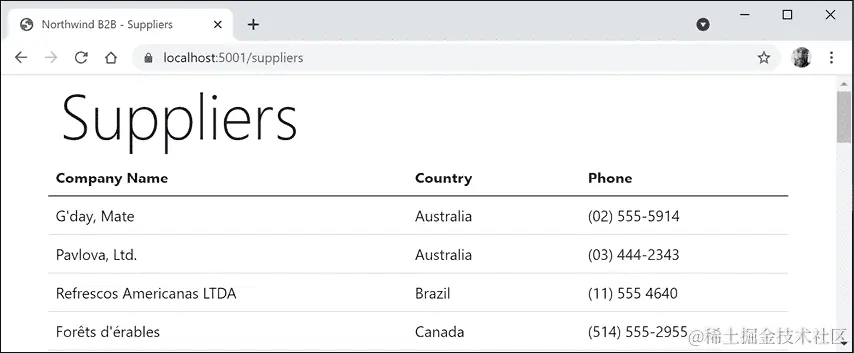 https://localhost:5001/suppliers,注意到匹配到了一个端点路由/Suppliers,并且执行了Suppliers.cshtmlRazor Page 来返回响应,如下所示:Endpoint name: /Suppliers Endpoint route pattern: Suppliers -