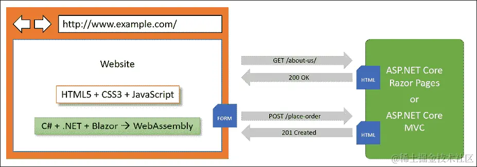 网站由多个网页组成,这些网页可以从文件系统静态加载或通过服务器端技术如 ASP.NET Core 动态生成。Web 浏览器使用唯一资源定位符(URLs)进行GET请求,这些 URL 标识每个页面,并可以使用POST、PUT和DELETE请求操作服务器上存储的数据。