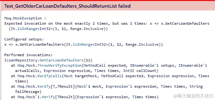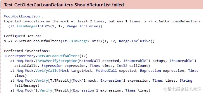 在上述测试片段中,将Times.AtLeast(2)传递给Verify方法。当运行测试时,由于被测试的代码中的GetCarLoanDefaulters方法只被调用了一次,测试将失败,并显示Moq.MoqException。
