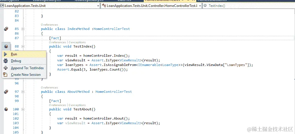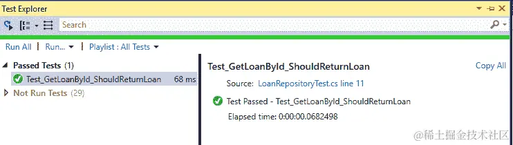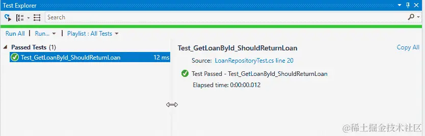 您可以从 Visual Studio 2017 的测试资源管理器窗口中运行Test_GetLoanById_ShouldReturnLoan测试方法。可以从测试菜单中打开此窗口,选择窗口,然后选择测试资源管理器。右键单击测试并选择运行选定的测试: