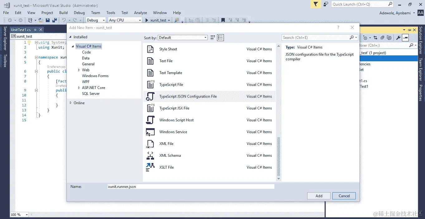 基于 MSTest 的单元测试项目可以添加到包含要测试的项目的现有解决方案中,按照在 Visual Studio 2017 中向解决方案添加新项目的步骤进行操作: