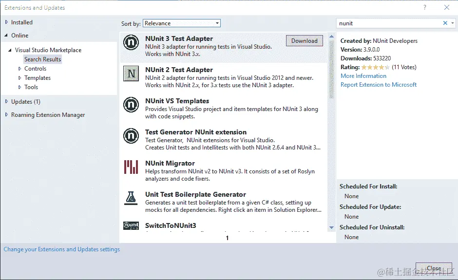 选择 NUnit 3 测试适配器并单击下载