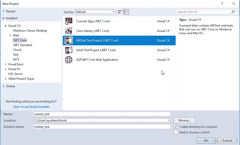 选择 MSTest 测试项目(.NET Core)并为项目指定一个名称。然后点击确定: