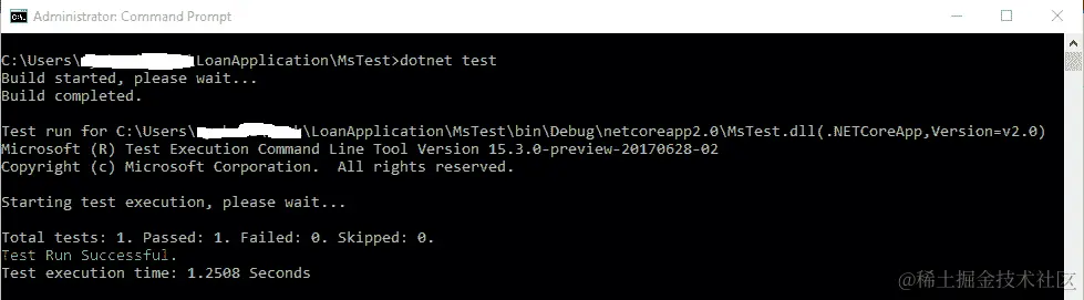 您还可以从控制台运行测试。打开命令提示窗口并将目录更改为包含测试项目的文件夹,或者如果要运行解决方案中的所有测试项目,则更改为解决方案文件夹。运行dotnet test命令。项目将被构建,同时可用的测试将被发现和执行: