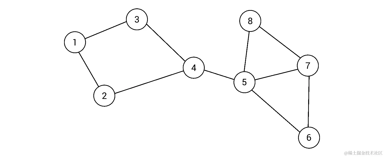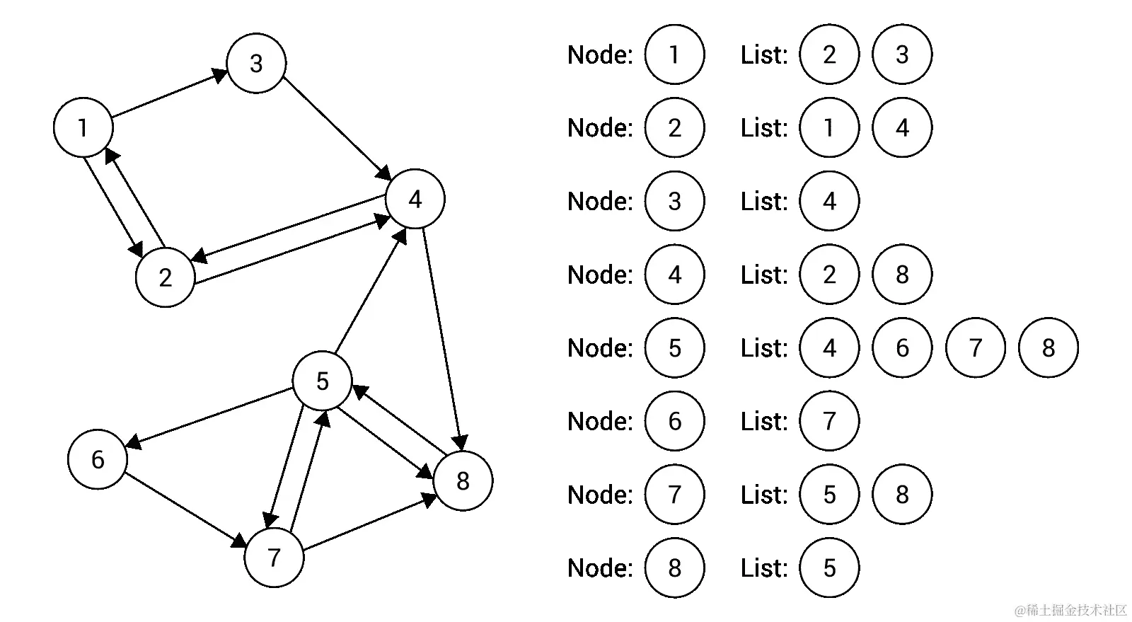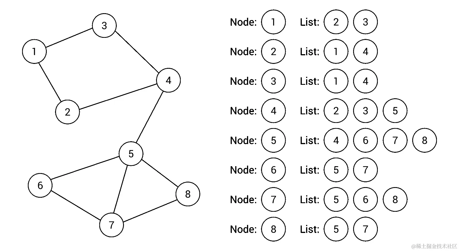 示例图包含 8 个节点和 10 条边。对于每个节点,创建了一个相邻节点(即邻居)的列表,如图表右侧所示。例如,节点1有两个邻居,即节点2和3,而节点5有四个邻居,即节点4,6,7和8。正如你所看到的,基于邻接表的无向无权图的表示非常直接,易于使用、理解和实现。
