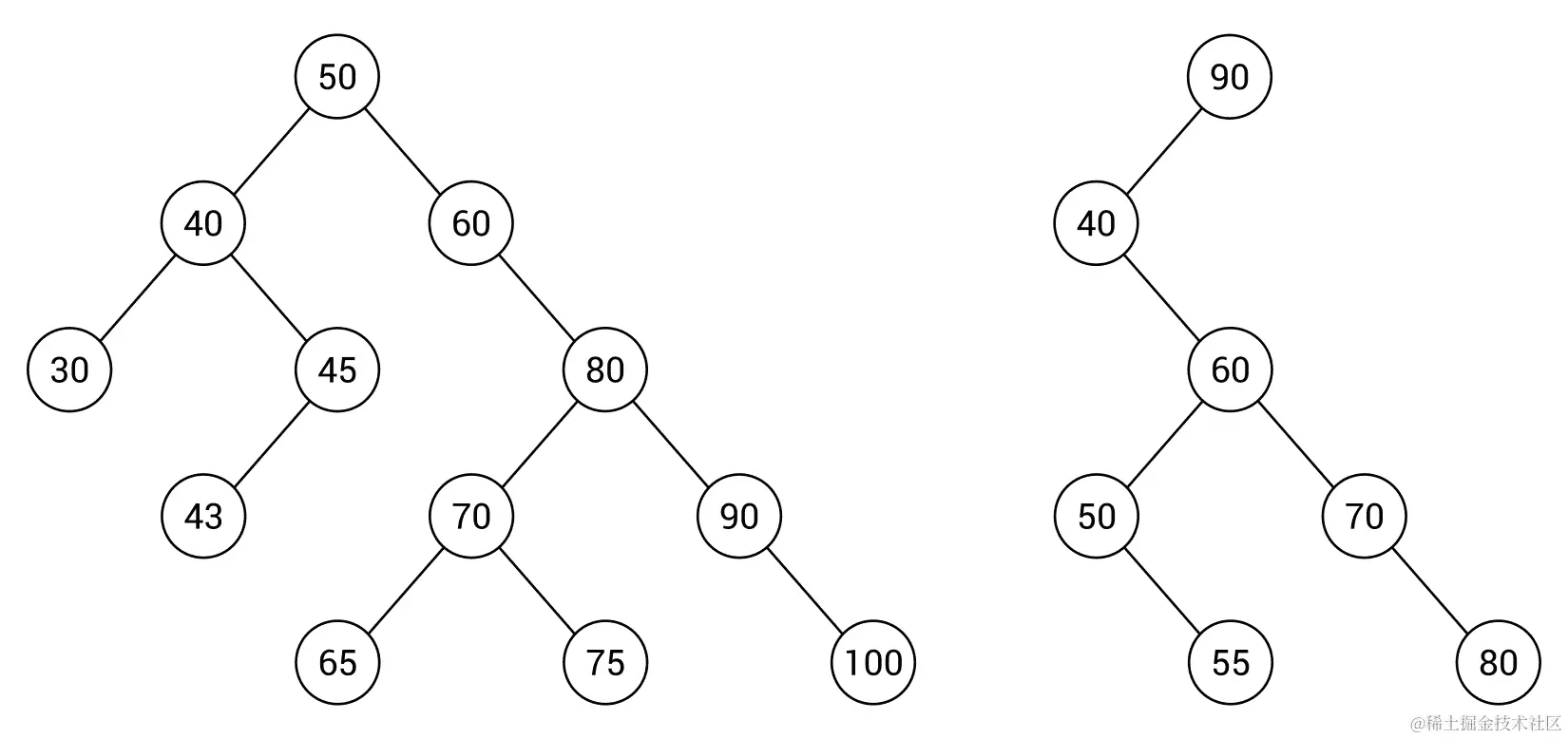 一般来说,树中的每个节点可以包含任意数量的子节点。但是,在二叉树的情况下,一个节点不能包含超过两个子节点,即它可以不包含子节点,或者只包含一个或两个,但是没有关于节点之间关系的规则。如果要使用二叉搜索树(BST),则引入下一个规则。它规定,对于任何节点,其左子树中所有节点的值必须小于其值,并且其右子树中所有节点的值必须大于其值。