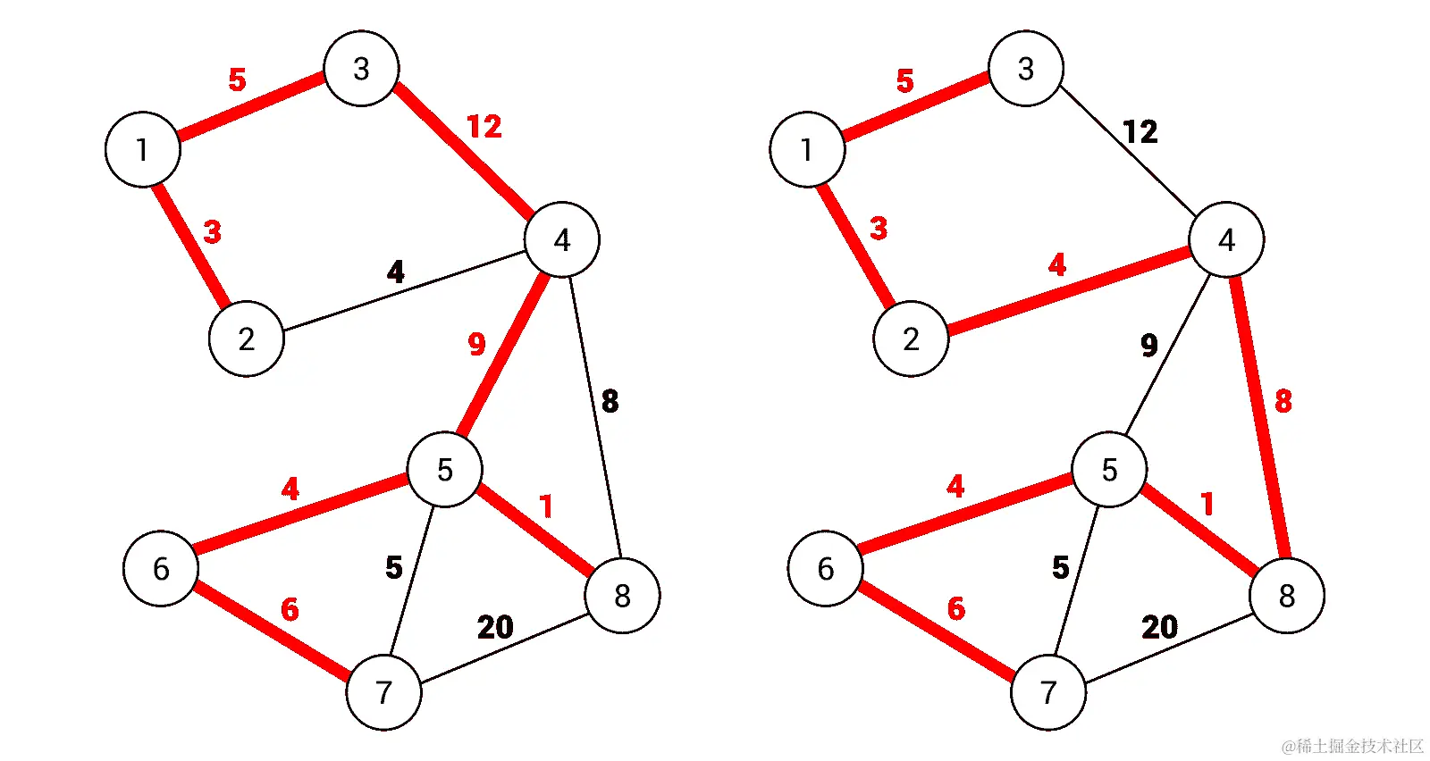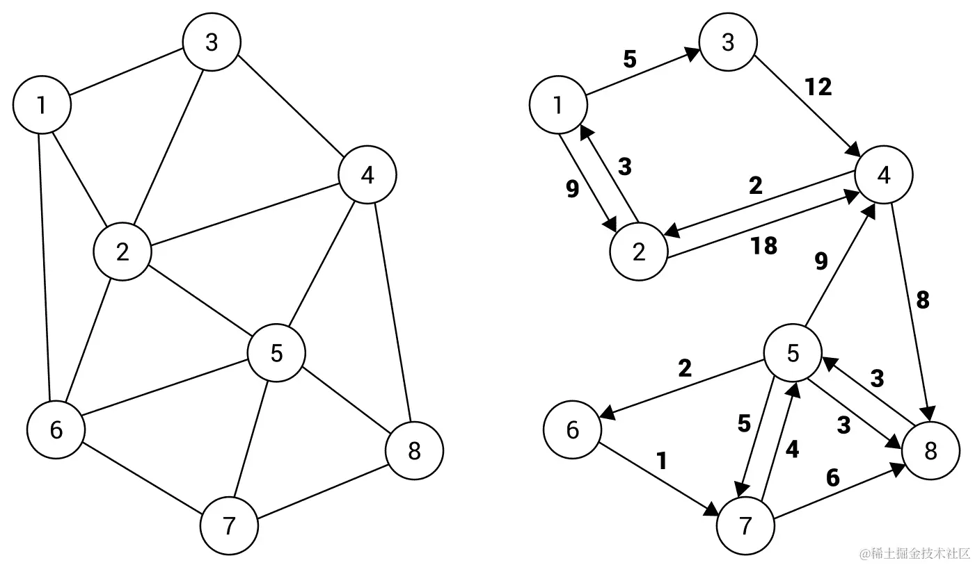 下图展示了带有无向(左侧)和有向(右侧)边的例子加权图: