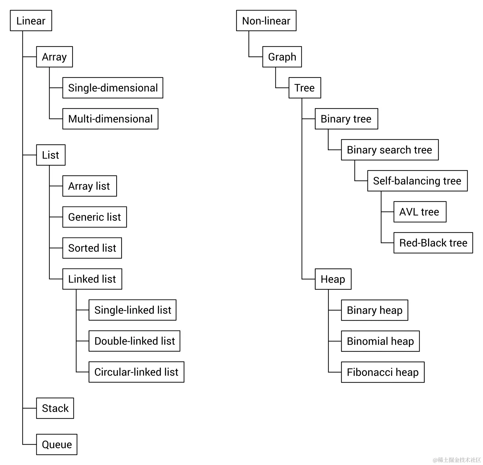 让我们来看看下面的图表,根据所提到的标准对数据结构进行分类: