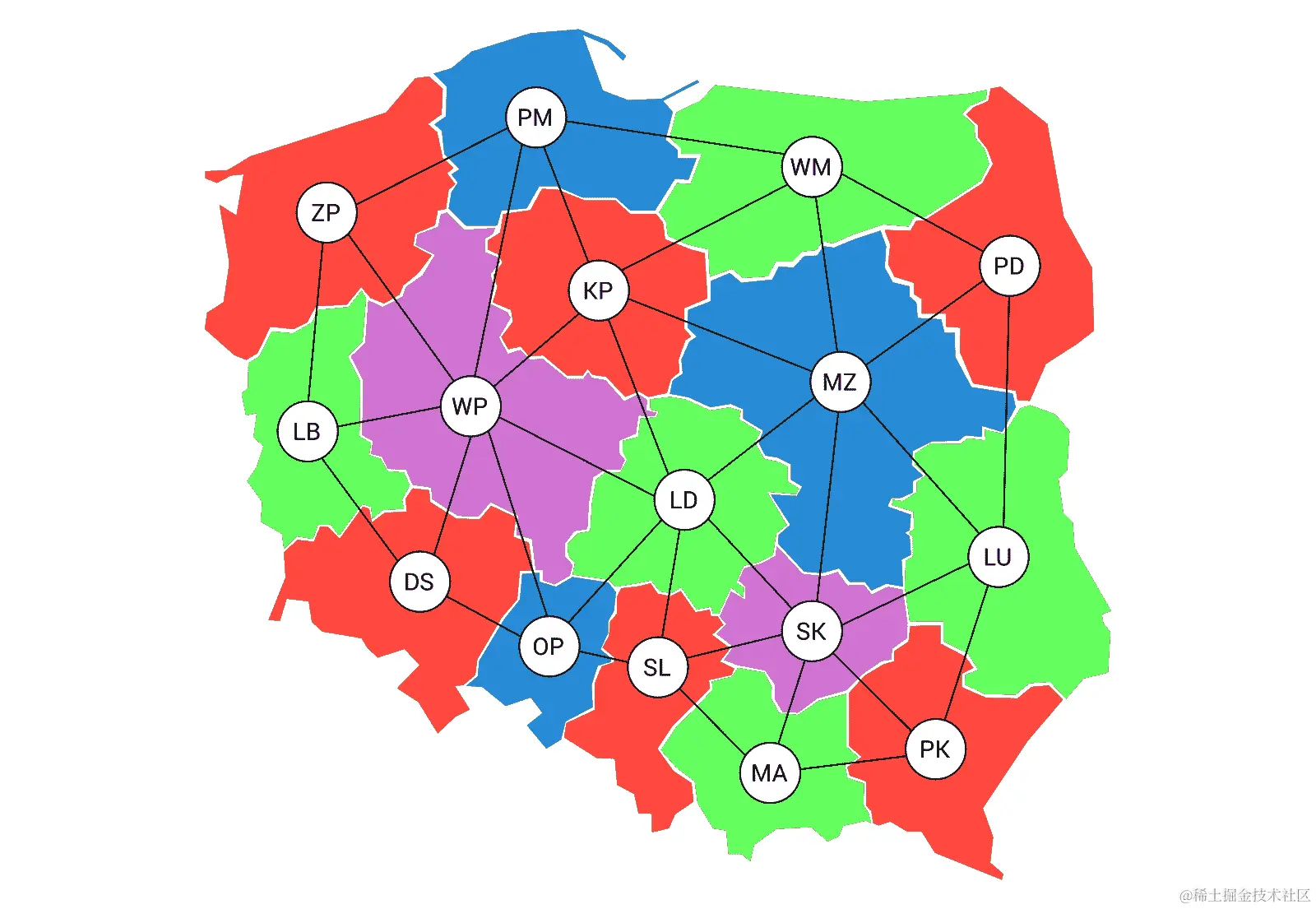 节点着色问题已经被用来根据这样一个规则对波兰地图上的省进行着色,即有共同边界的两个省份不能有相同的颜色。当然,颜色的数量应该是有限的。