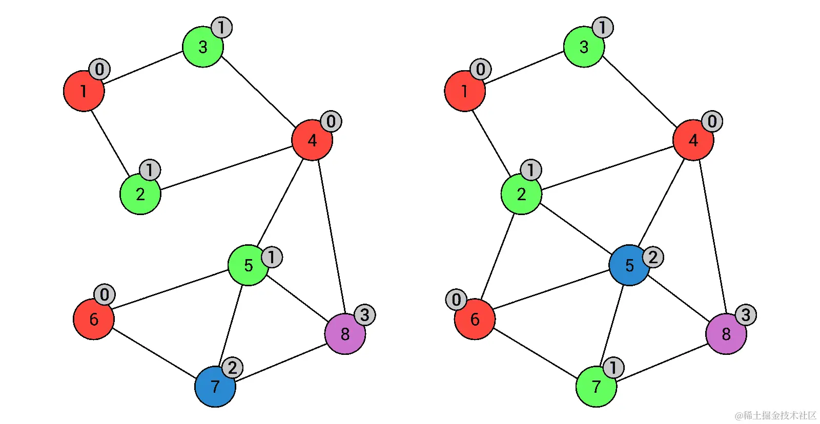 然后,您学习了下面两个流行的与图相关的问题的解决方案。第一个是节点的着色,您需要为所有节点分配颜色(数字),以符合不能存在相同颜色的两个节点之间的边的规则。当然,颜色的数量应该尽可能少。