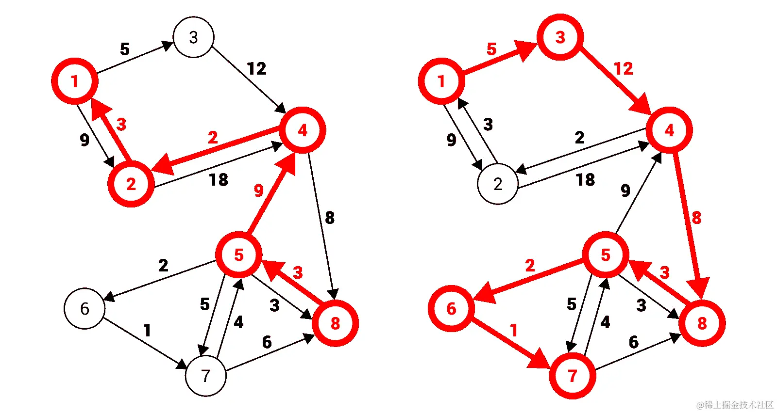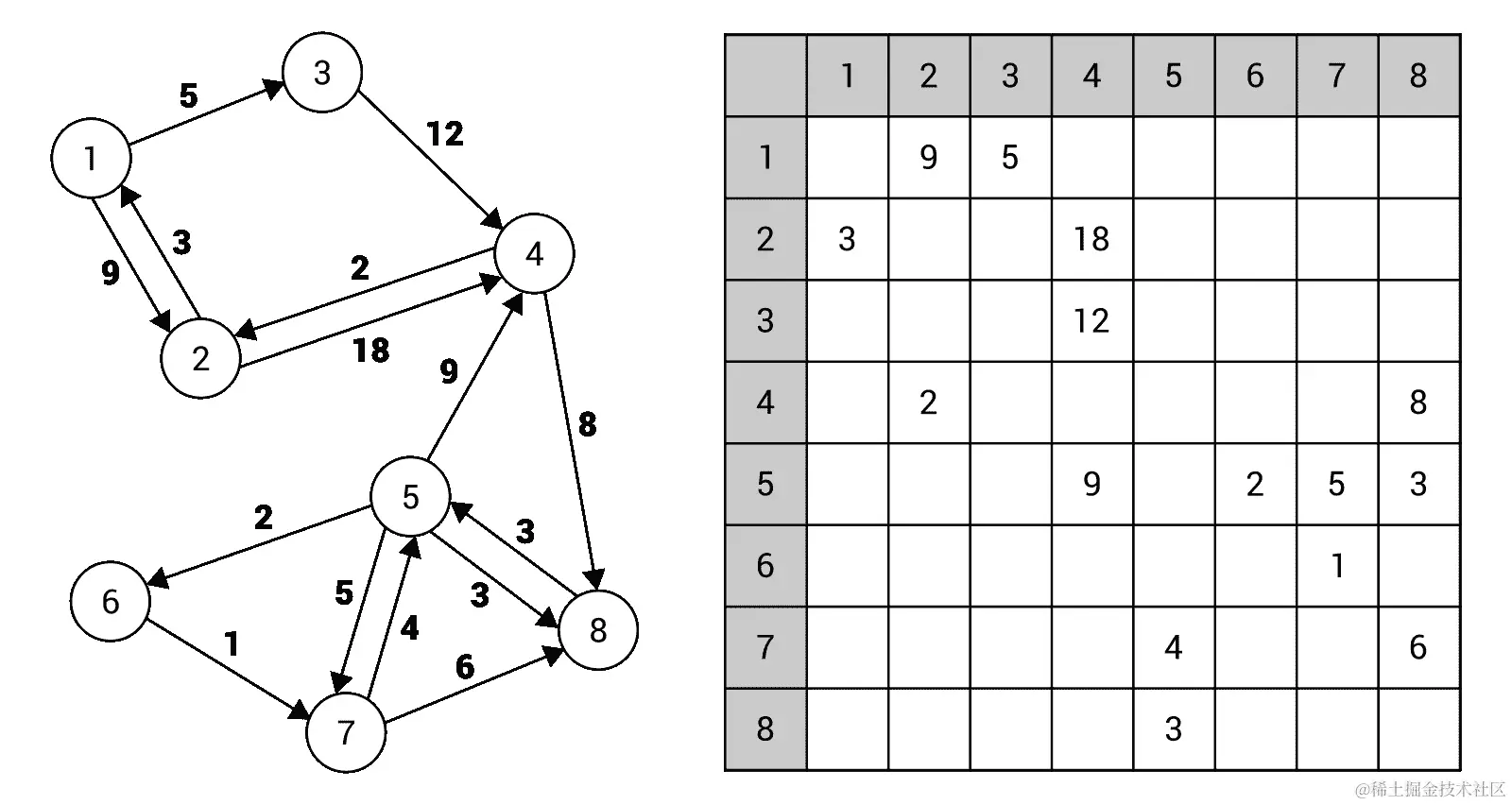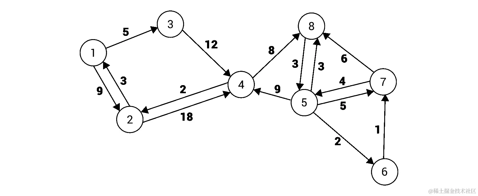 简单解释一下,在前面图中右侧的有向图包含了 8 个节点,通过 15 条单向边连接。例如,它们表示可以在节点1和2之间双向旅行,但是只能从节点1到3单向旅行,所以无法直接从3到1。