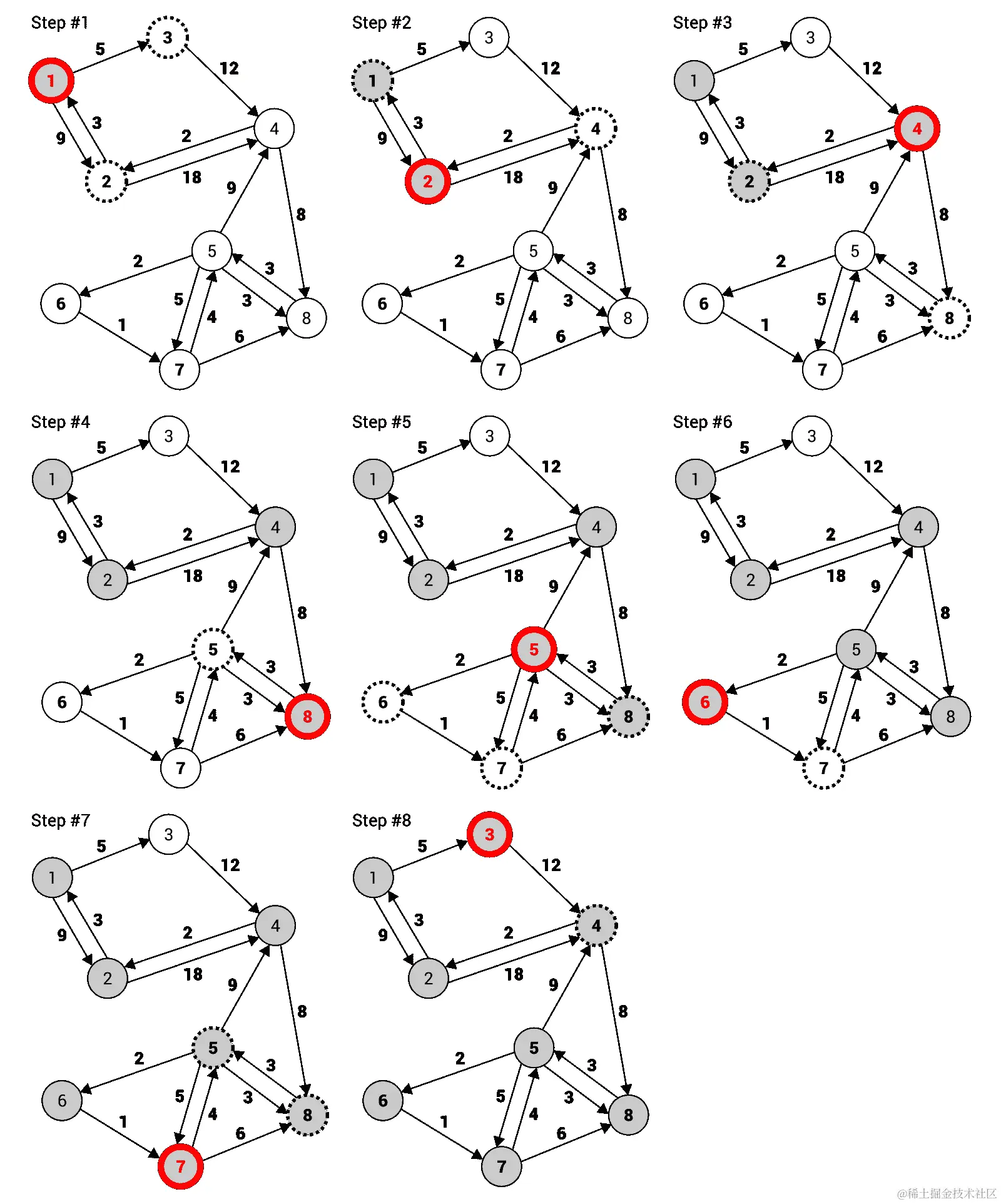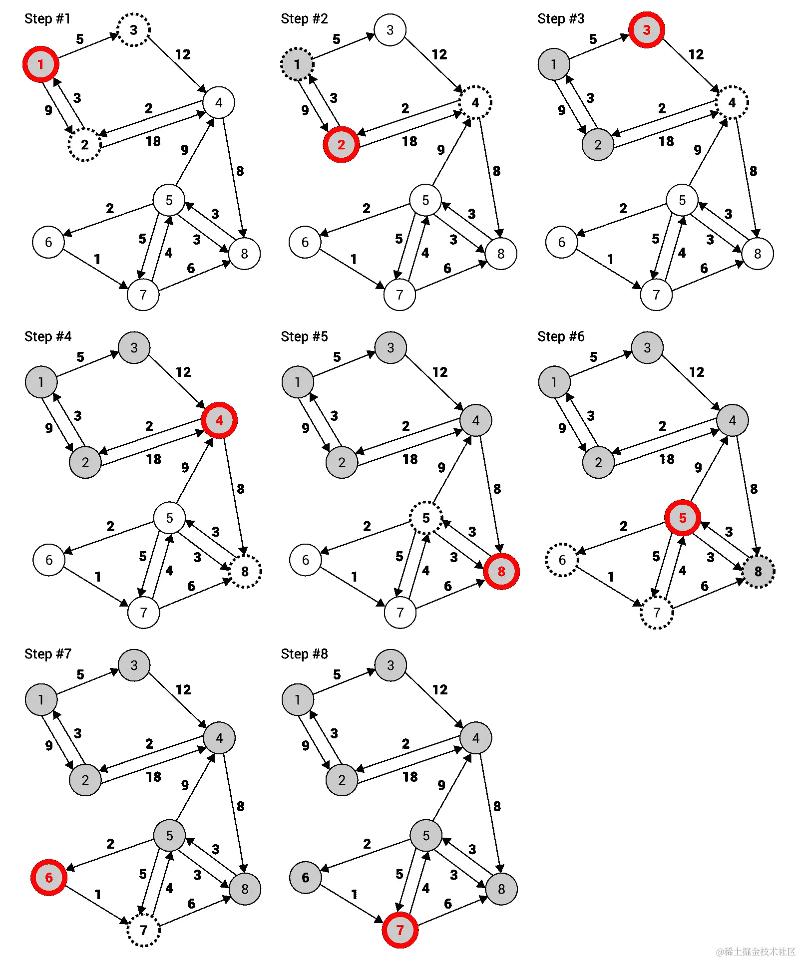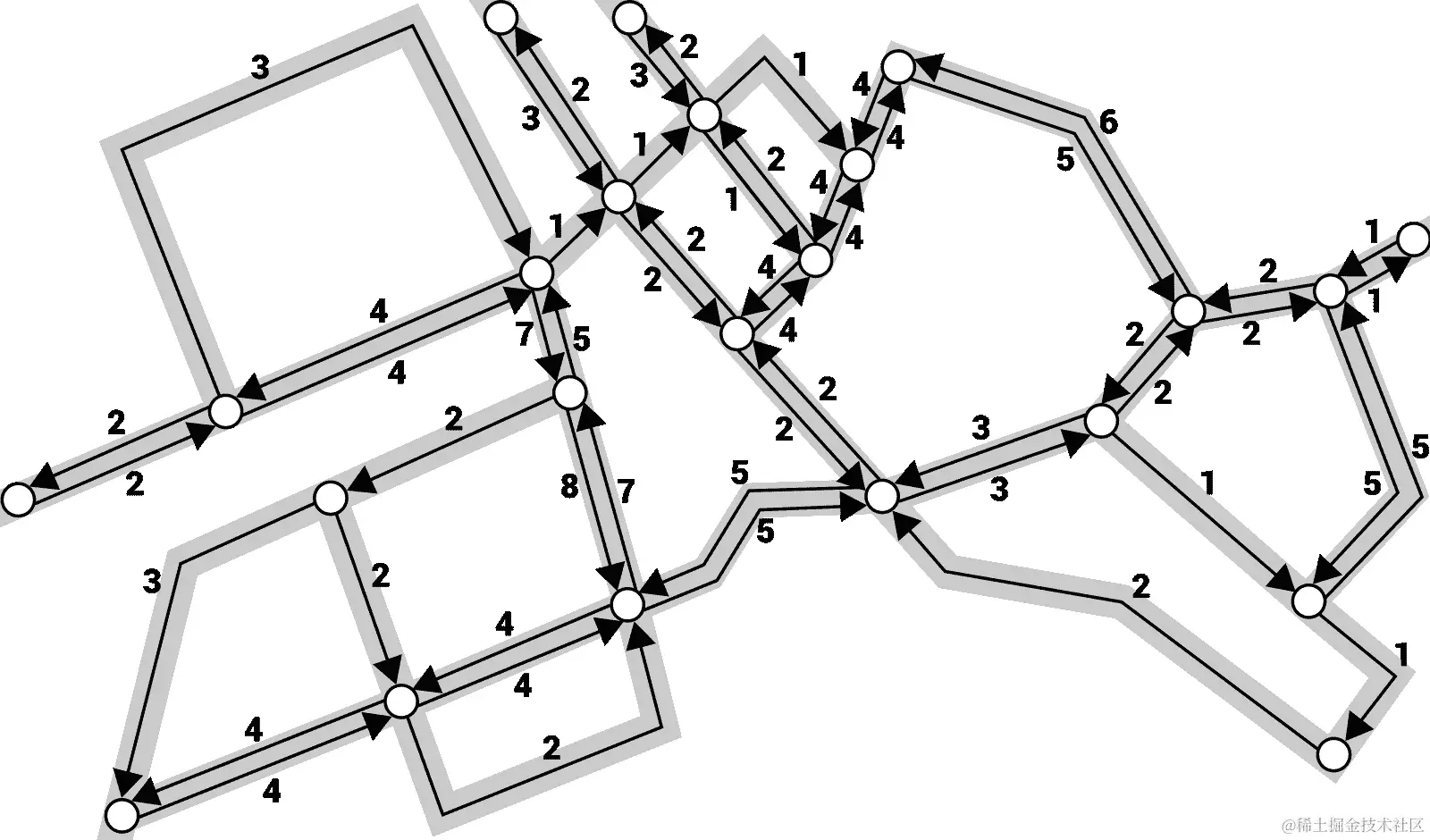 简单解释一下,在前面图中右侧的有向图包含了 8 个节点,通过 15 条单向边连接。例如,它们表示可以在节点1和2之间双向旅行,但是只能从节点1到3单向旅行,所以无法直接从3到1。