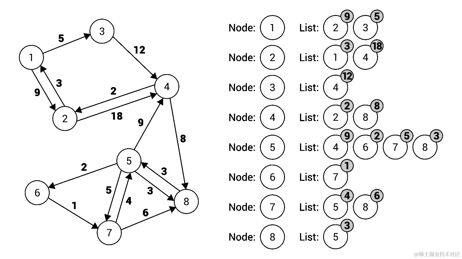 节点7的邻接表包含两个元素,即指向节点5的边(权重为4)和指向节点8的边(权重为6)。