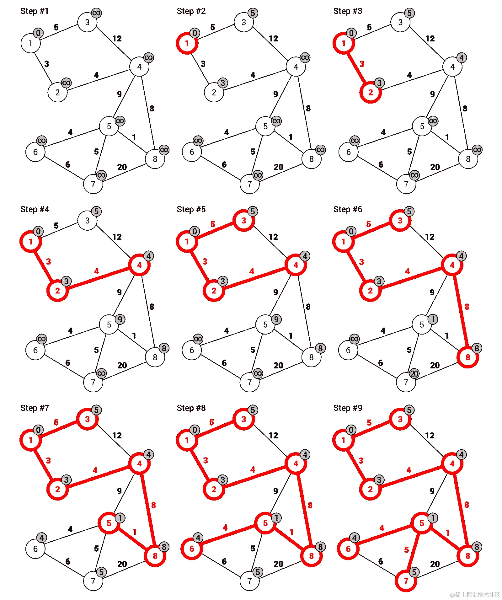 前面的图和邻接矩阵都是不言自明的。然而,为了消除任何疑惑,让我们看一下节点5和6之间权重为2的边。这样的边由矩阵中第五行和第六列的元素表示。元素的值等于这些节点之间的旅行成本。