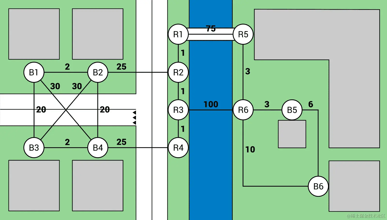 图的另一个常见应用涉及搜索最短路径的问题。想象一下一个程序,它应该找到城市中两点之间的路径,考虑到行驶特定道路所需的时间。在这种情况下,你可以使用图来表示城市的地图,其中节点表示交叉路口,边表示道路。当然,你应该为边分配权重,以指示行驶给定道路所需的时间。搜索最短路径的主题可以理解为找到从源节点到目标节点的边的列表,其总成本最小。基于图的城市地图的图表如下所示: