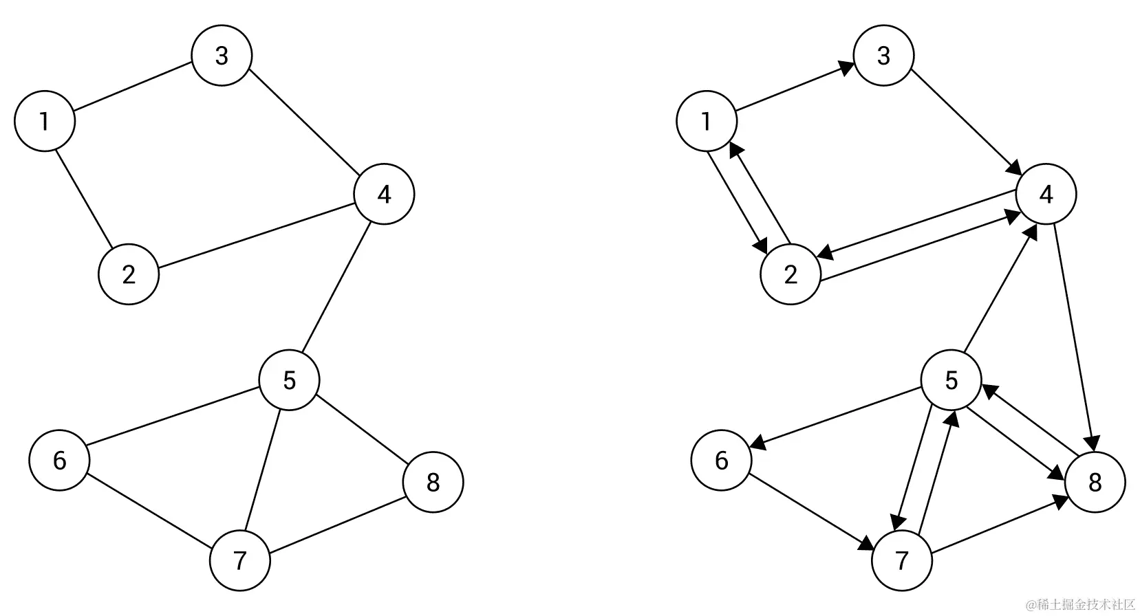 一个有向图的例子在右侧的下图中展示,而一个无向图在左侧展示: