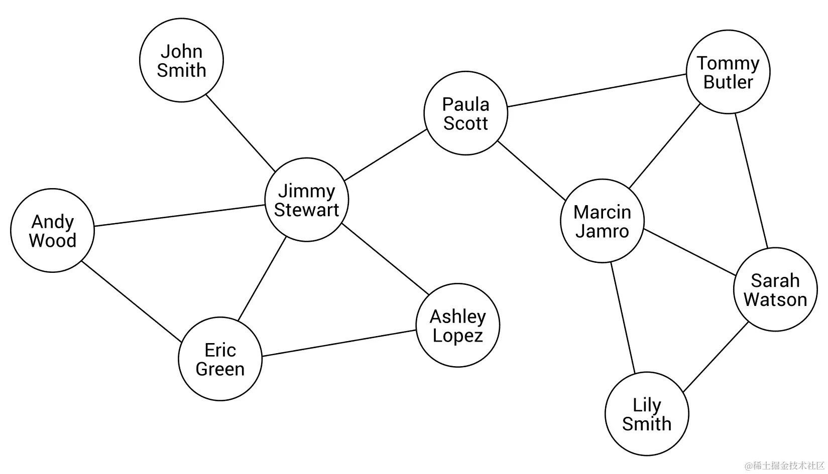 正如你所看到的,Jimmy Stewart有五个联系人,分别是John Smith,Andy Wood,Eric Green,Ashley Lopez和Paula Scott。与此同时,Paula Scott还有另外两个朋友:Marcin Jamro和Tommy Butler。通过使用图作为数据结构,你可以轻松地检查两个人是否是朋友,或者他们是否有共同的联系人。