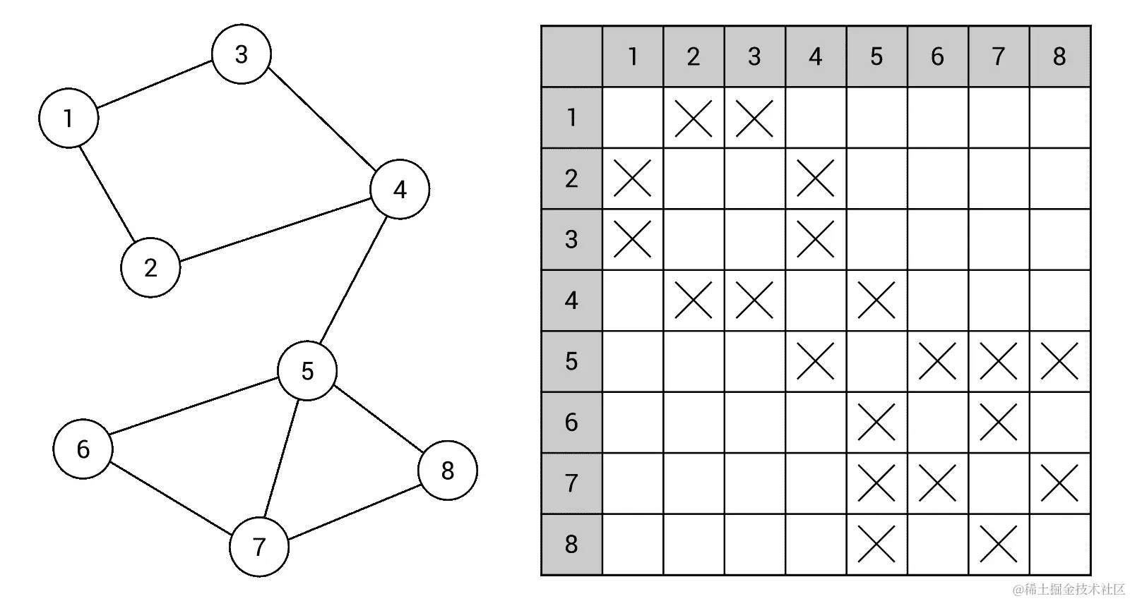 在这里,邻接矩阵包含 64 个元素(八行八列),因为图中有八个节点。数组中许多元素的值设置为false,表示缺失指示。其余的用叉号表示true值。例如,在第四行和第三列的元素中的这样一个值表示图中节点4和3之间有一条边,如前面图中所示。
