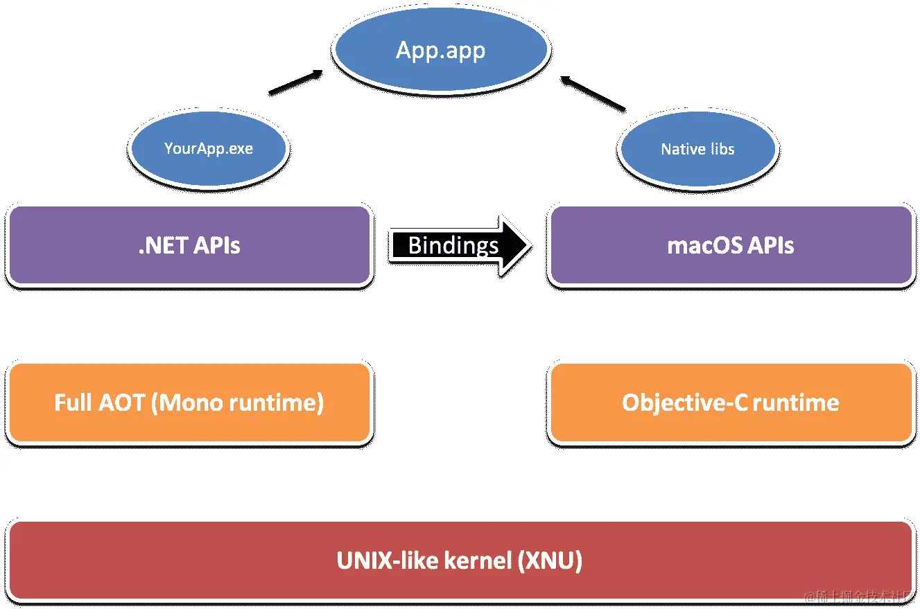 Xamarin.Mac 用于使用.NET 构建 macOS 应用程序,并包含了对 macOS API 的绑定。Xamarin.Mac 与 Xamarin.iOS 具有相同的架构,唯一的区别是 Xamarin.Mac 应用程序是 JIT 编译的,而不像 Xamarin.iOS 应用程序是 AOT 编译的。如下图所示:
