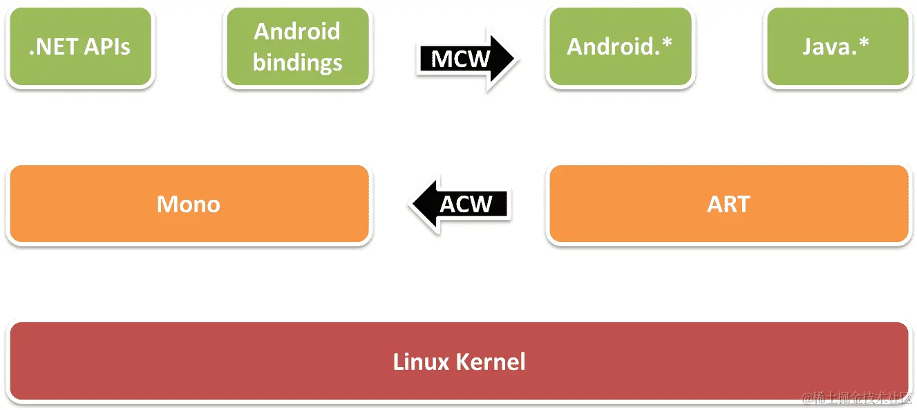 Mono 运行时和 Android 运行时之间的通信通过Java 本地接口(JNI)桥接发生。有两种类型的 JNI 桥接:管理可调用包装器(MCW)和Android 可调用包装器(ACW)。当代码需要在Android 运行时(ART)中运行时,使用MCW,当ART需要在 Mono 运行时中运行代码时,使用ACW,如下图所示: