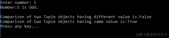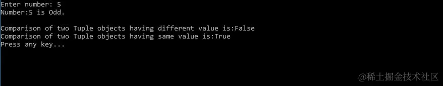 Console.WriteLine($"Equality of two Tuple objects is:{equalToTuple}");