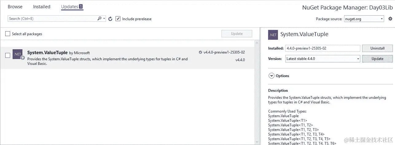 在 C# 7.0 中,元组需要 NuGet 包System.ValueType。这实际上是一个结构。它包含一些静态和公共方法来进行操作: