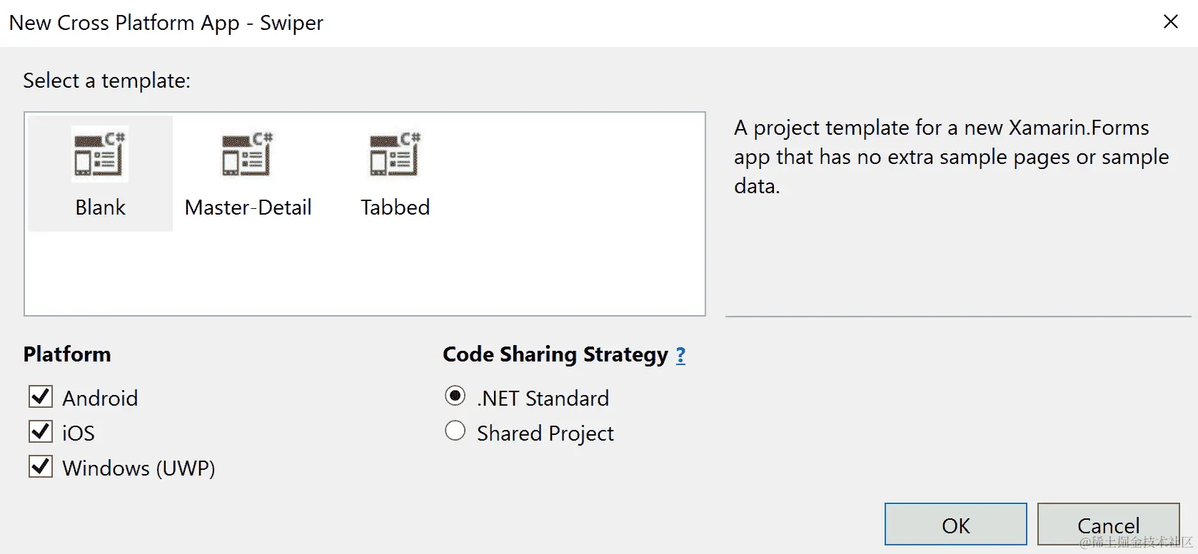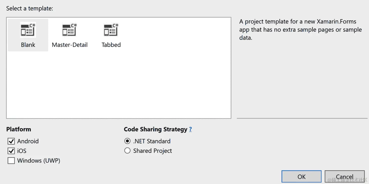 下一步是选择项目模板和代码共享策略。选择空白以创建最少的 Xamarin.Forms 应用程序,并确保代码共享策略设置为.NET 标准。通过单击确定完成设置向导,让 Visual Studio 为您搭建项目。这可能需要几分钟。