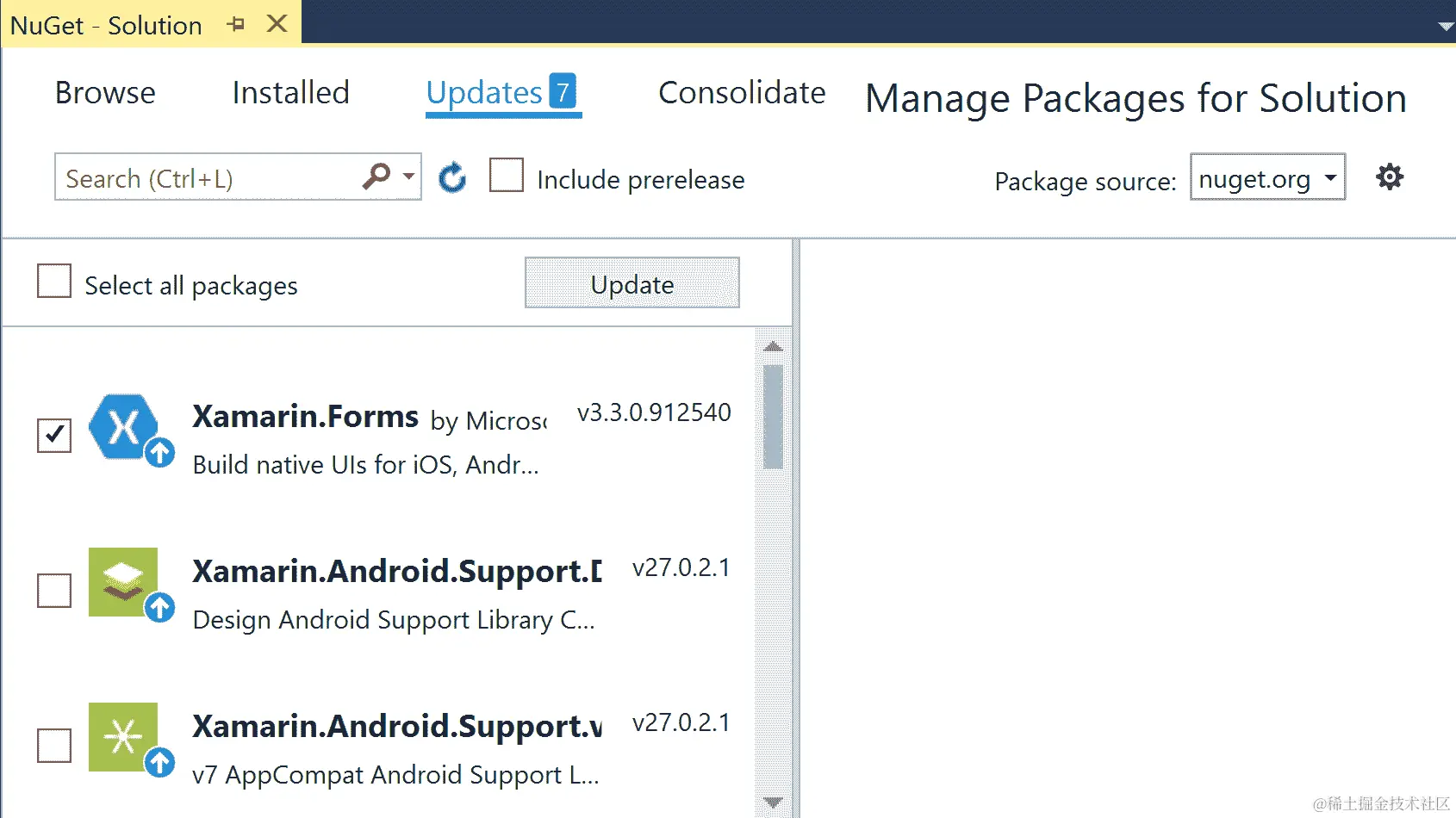 检查 Xamarin.Forms 并点击“更新”。