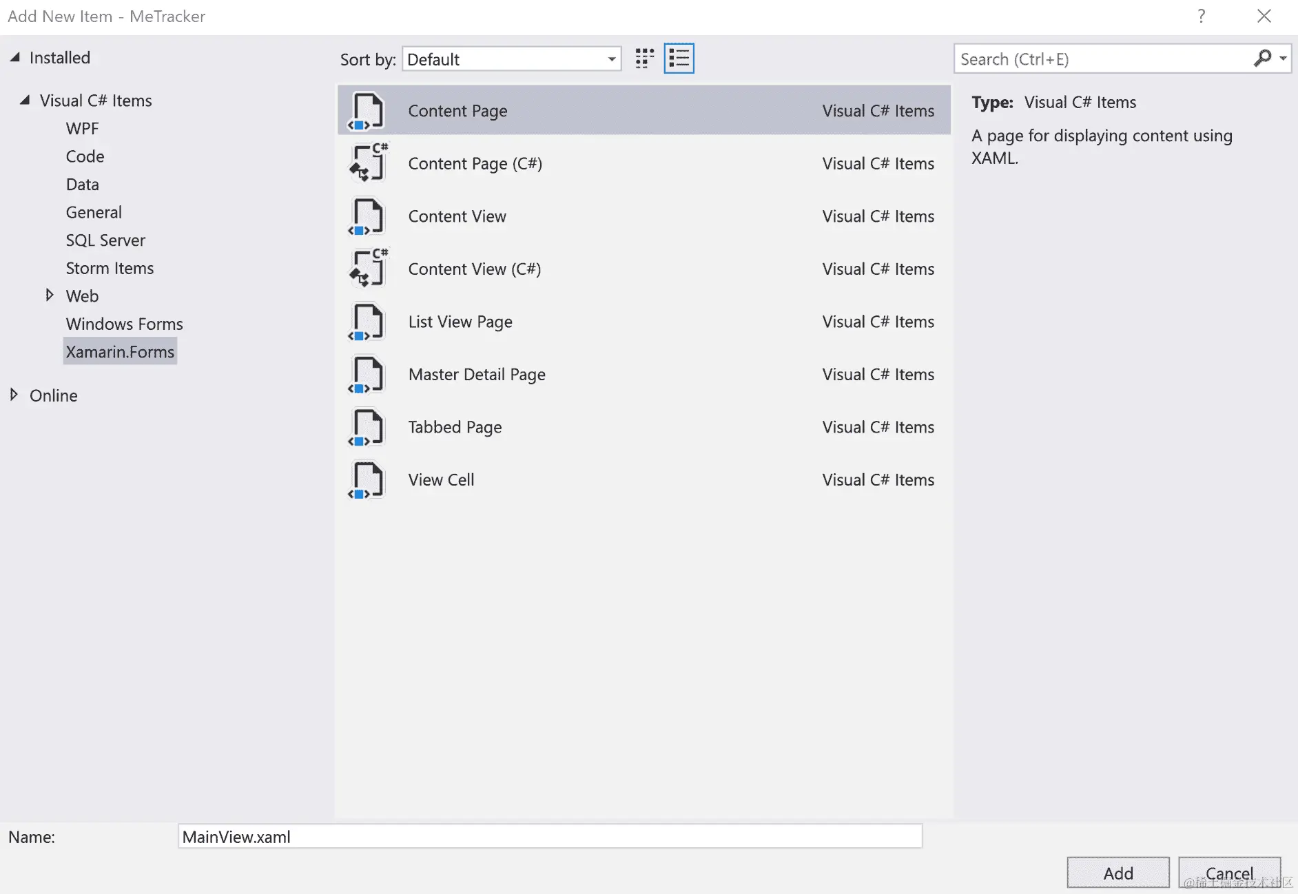 在“添加新项”对话框框的左窗格中选择 Visual C#项目,然后选择 Xamarin.Forms。