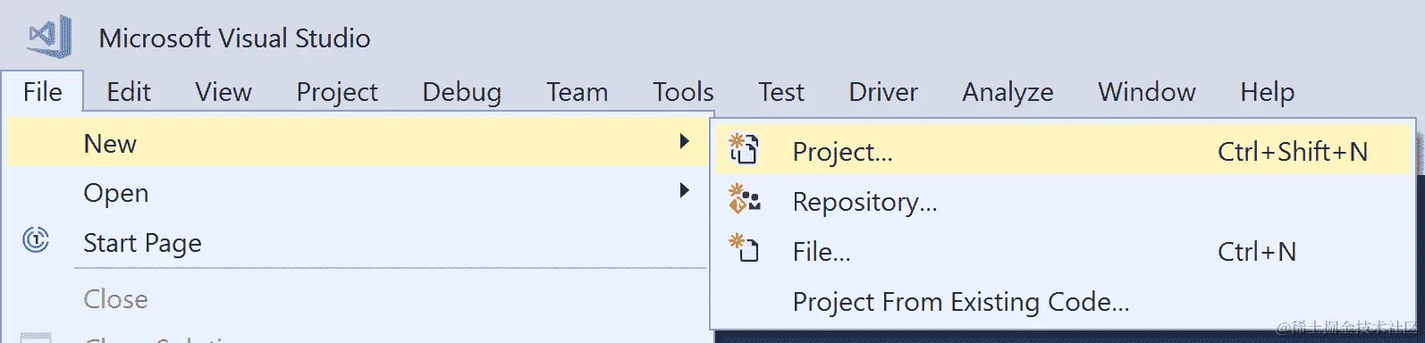 打开 Visual Studio 并单击文件|新建|项目: